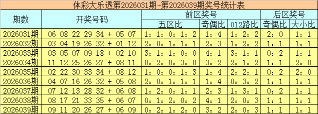 体彩大乐透第2026039期奖号为09 11 20 26 27 + 06 09,前区号码五区比为0:2:1:2:0,奇偶比为3:2,012路比为2:0:3,后区号码奇偶比为1:1,大小比为1:1。